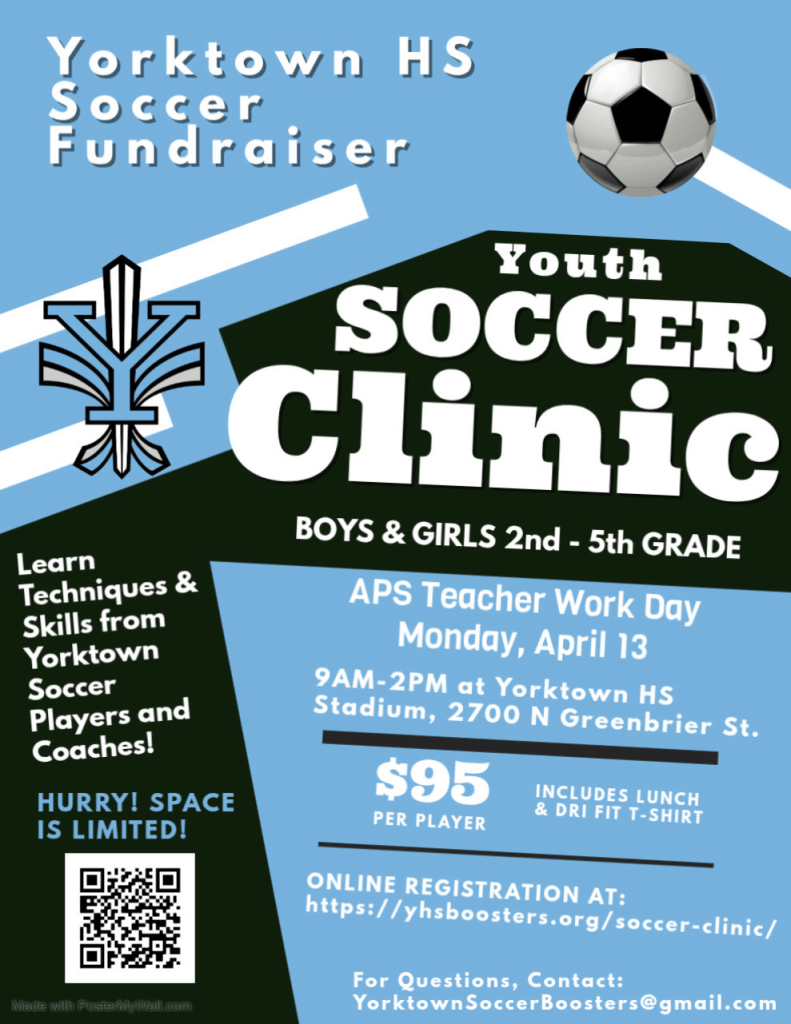 Youth soccer enthusiasts will want to join Yorktown High School soccer players and coaches for a fun-filled soccer clinic on Monday, April 13, 2026 (No School for APS – Grade Prep Day) from 9:00 AM to 2:00 PM.